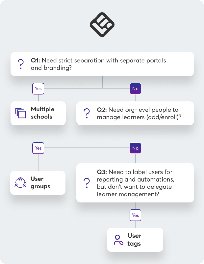 This guide walks through three concrete architecture patterns for multi-client training in LearnWorlds. Each pattern uses specific tools (User Groups, User Tags, and Multiple Schools) to create boundaries that are clear enough to scale safely and practical enough to manage in the real world.