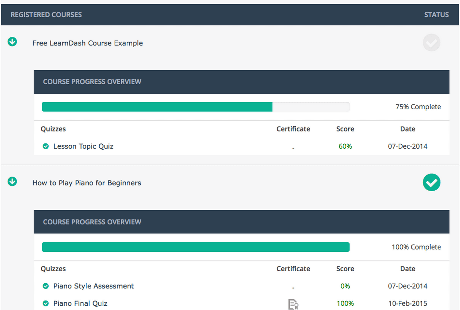 - quizzes, assignments, certificates