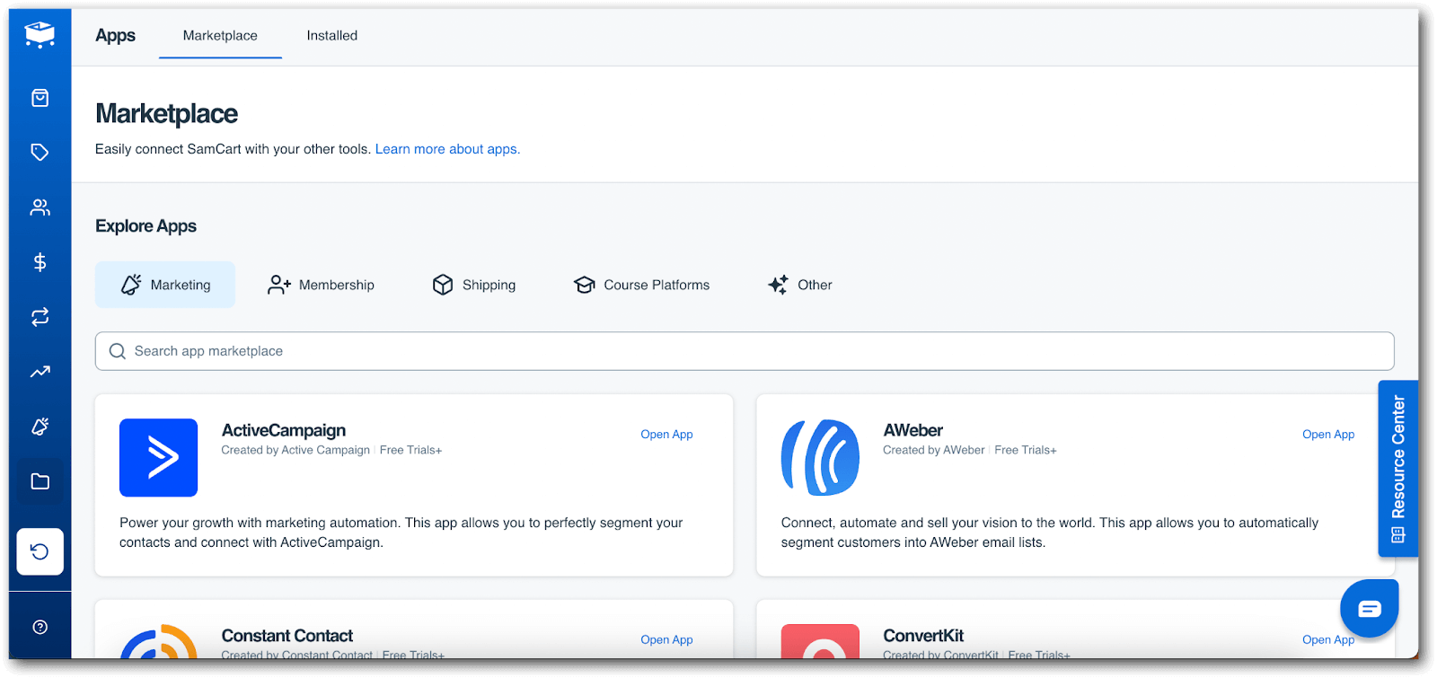 - email/CRM integrations, landing pages, upsells