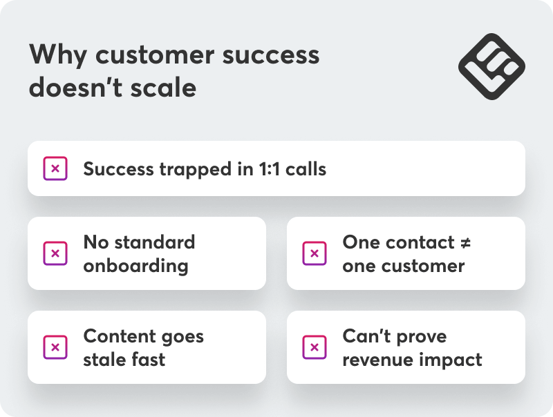 - Customer success doesn’t scale when knowledge lives in individual conversations rather than reusable systems.