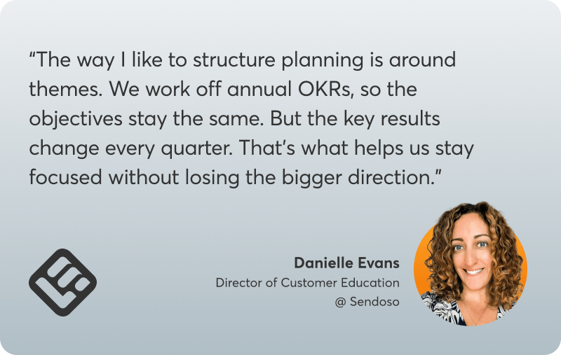 A concrete example she gave: one OKR is supporting expansion revenue, and a big piece of that is showcasing Sendoso’s international capabilities. Instead of treating “webinar season” and “course roadmap” as separate plans, the team builds a connected chain.