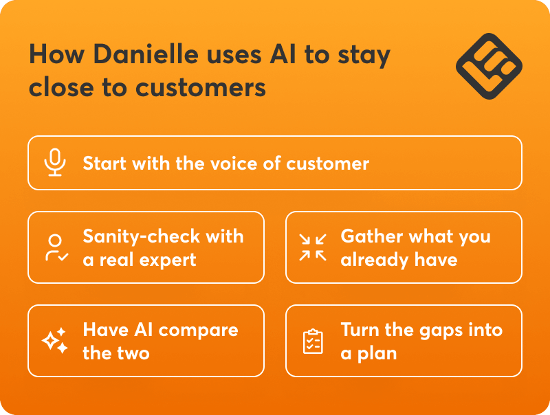 As she recently shared on LinkedIn, Danielle uses AI to stay close to the customer reality. Instead of sifting through endless CSM call summaries herself, she turns to AI for help: